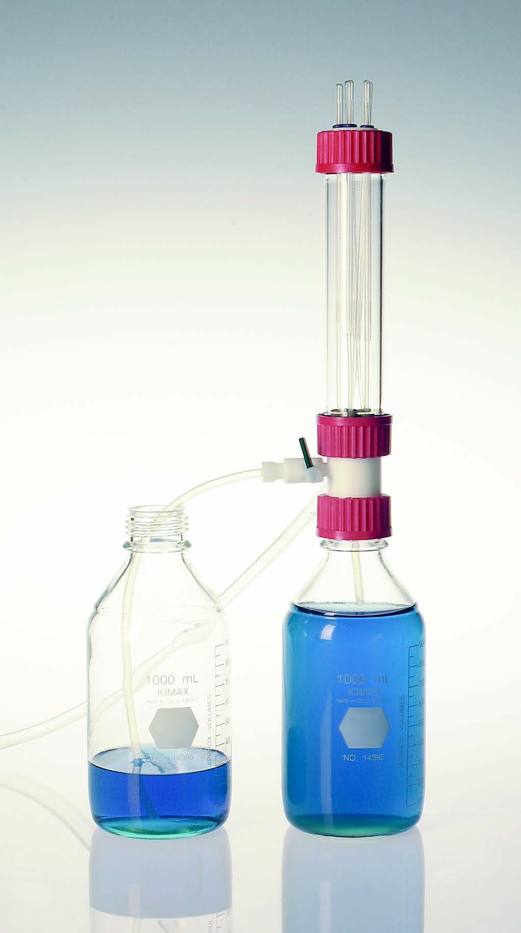 source (user supplied) is required. An o-ring is slipped over each tubπe to form a vacuum tight seal and is removed after washing. The complete unit is provide→d with a one liter reservoir bottle and all wetted parts are PTFE or bor≠osilicate glass. When all tubes are positioned for ≠cleaning, the wash valve is configured to either wash or dry; this action may easily be r epeated, and cleaned tubes can be quickly removed for use.