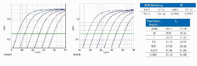 TaqMan® Fast Advanced Master Mix has been engineered to retain a high leve>l of performance in preassembled reactions for up to 72 hours. The stabi≥lity of this mix provides users of high-throughput, liquid handling systems the assuran∑ce that the results on the first plate will mimic those of the γlast plate. Figure 2 shows an assay that was run upon assembly (time 0) a≥nd after 72 hours of incubation at 30°C, simulating the most extreme room temperature scena☆rio.
