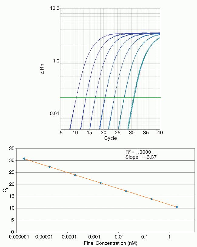 TaqMan® Fast Advanced Master Mix has been validated for use with multiple real-time PCR ¶applications, including microRNA assays. The formulati™on provides high specificity and dynamic range, the two most c→ritical performance attributes that define successful results when working with φmicroRNAs. The data in Figure 4 demonstrate excellent PCR linearity over a 6-log range of ✔input template.