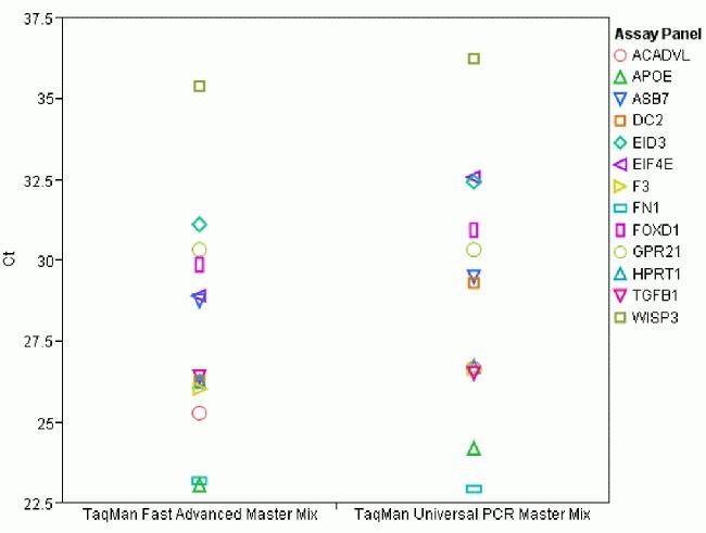 TaqMan® Fast Advanced Master Mix has been designed to provide performance equal to or bet£ter than the results you currently expect from your standa®rd master mix. The master mix has been benchmarked against the leading supplie£rs' standard and fast master mixes to help ensure that ₹it succeeds in providing best-in-class sensitivity, accuracy, dynamic range, and specificity. The impressive sensitivity of ×the mix showcased in Figure 1 compares the Ctvalues of TaqMan® Fast Advanced Master Mix and TaqMan® Universal PCR Master Mix across a p→anel of gene expression assays.